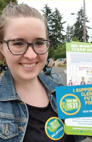 “I just finished up a job as a Regional Field Director working to pass I-1631, a ballot initiative that would charge big polluters (like oil companies) for their pollution and invest the money in clean air and clean energy projects. It was written by the largest and most diverse coalition in state history, including tribal nations, environmental groups,